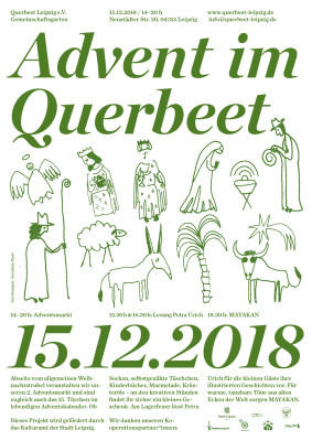 Wir veranstalten unseren 2. Adventsmarkt und sind zugleich das 15. Türchen des lebendigen Adventskalenders im Leipziger Osten. Ob Socken, Kinderbücher, selbstgenähte Täschchen, Marmelade oder Kräuteröle - an den vielen Ständen findet mensch sicher ein herzerwärmendes kreatives Geschenk. Am Lagerfeuer liest Petra Urich um 15.30 Uhr und 16.30 Uhr ihre illustrierten Buch-Geschichten vor. Daneben gibt es eine Siebdruck-Station und Mitsing-Lieder am Lagerfeuer. Für warme tanzbare Töne aus allen Ecken der Welt sorgen MAYAKAN ab 18.30 Uhr. Wir freuen uns auf Ihren & Euren Besuch!
