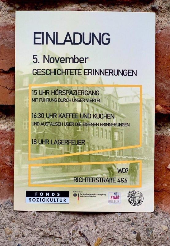 “Geschichtete Erinnerungen” ist Teil eines Projektes, das uns im Rahmen einer Förderung durch Neustart Kultur ermöglicht, Vernetzung in unserem Viertel zu fördern und unsere Geschichte(n) in Zukunft für alle zugänglich zu machen. Ziel ist es, eine Website zu gestalten, die die gesammelten Geschichten unseres Hauses und hinzukommend unseres Viertels zu einem Mikrokosmos des gemeinschaftlichen Wissens verbinden soll.
