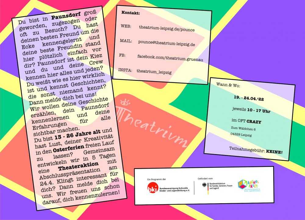 Du bist in Paunsdorf groß geworden, zugezogen oder oft zu Besuch? Du hast deinen besten Freund um die Ecke kennengelernt und deine beste Freundin stand hier plötzlich einfach vor dir? Paunsdorf ist dein Kiez und du und deine Crew kennen hier alles und jeden? Du weißt wie es hier wirklich ist und kennst Geschichten, die sonst niemand kennt? Dann melde dich bei uns! Wir wollen deine Geschichte erzählen, dein Paunsdorf kennenlernen und deine Erfahrungen für alle sichtbar machen. Du bist 13 - 26 Jahre alt und hast Lust, deiner Kreativität in den Osterferien freien Lauf zu lassen? Gemeinsam entwickeln wir in 5 Tagen eine Theateraktion mit Abschlusspräsentation am 24.4. Klingt interessant für dich? Dann melde dich bei uns. Wir freuen uns schon darauf, dich kennenzulernen!
